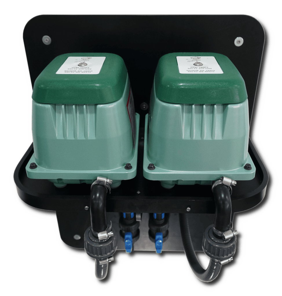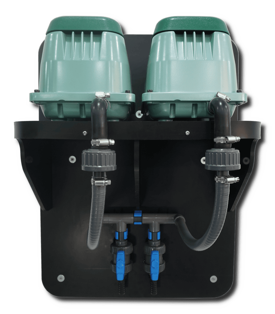 Bei einem Ausfall einer Belüfterpumpe, belüftet die Verbleibende dennoch alle Ausgänge am System. Teich und Biofilter werden so weiterhin mit Luft versorgt.
